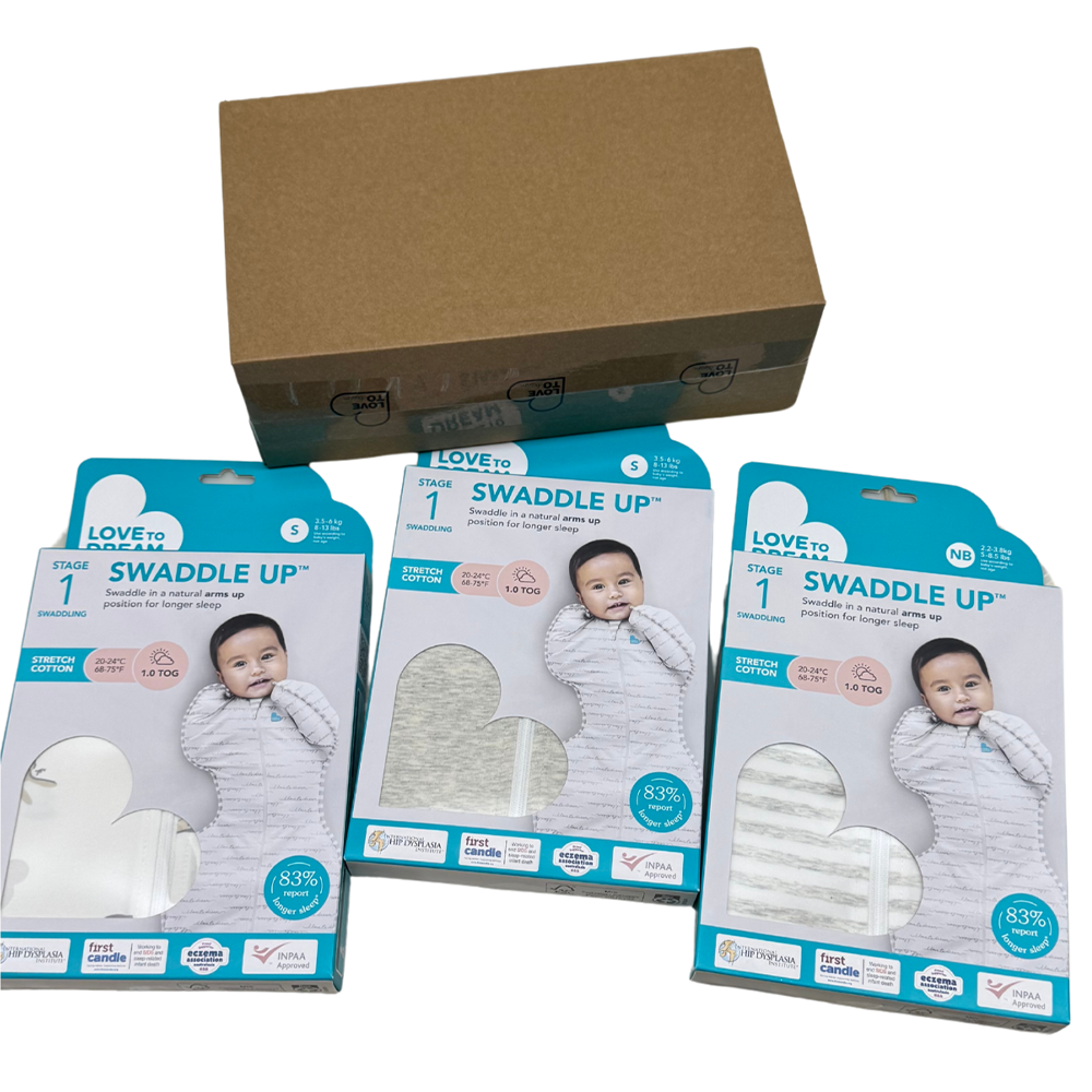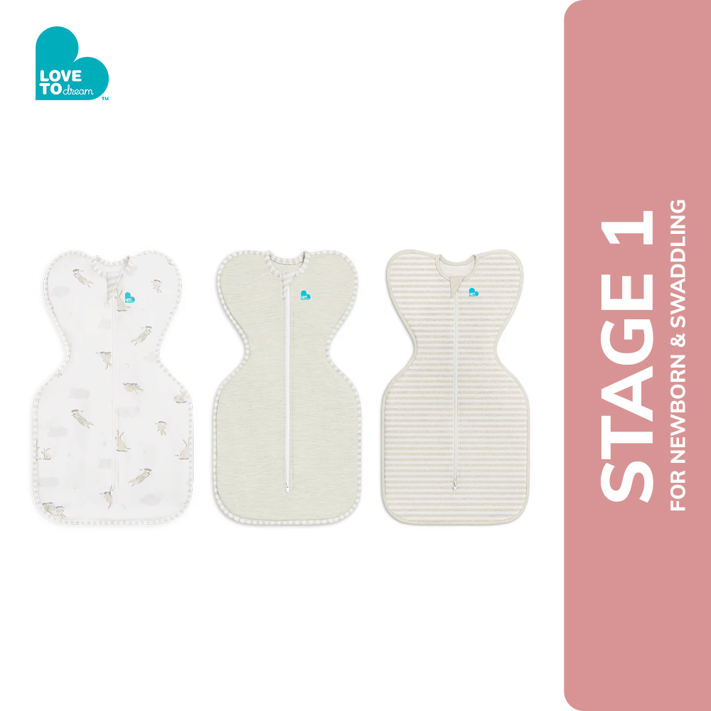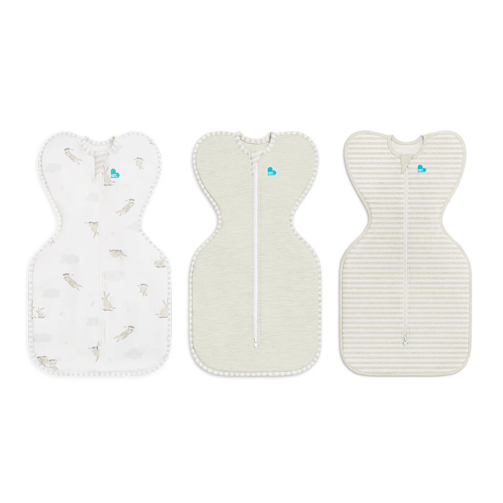This bundle includes 1x Swaddle Up™ 1.0 TOG Cotton White Cloud Bunnies in size Small, 1x Swaddle Up™ 1.0 TOG Cotton Sand Dollar in size Small and 1x Swaddle Up™ 1.0 TOG Cotton Sand Stripe in size Newborn.